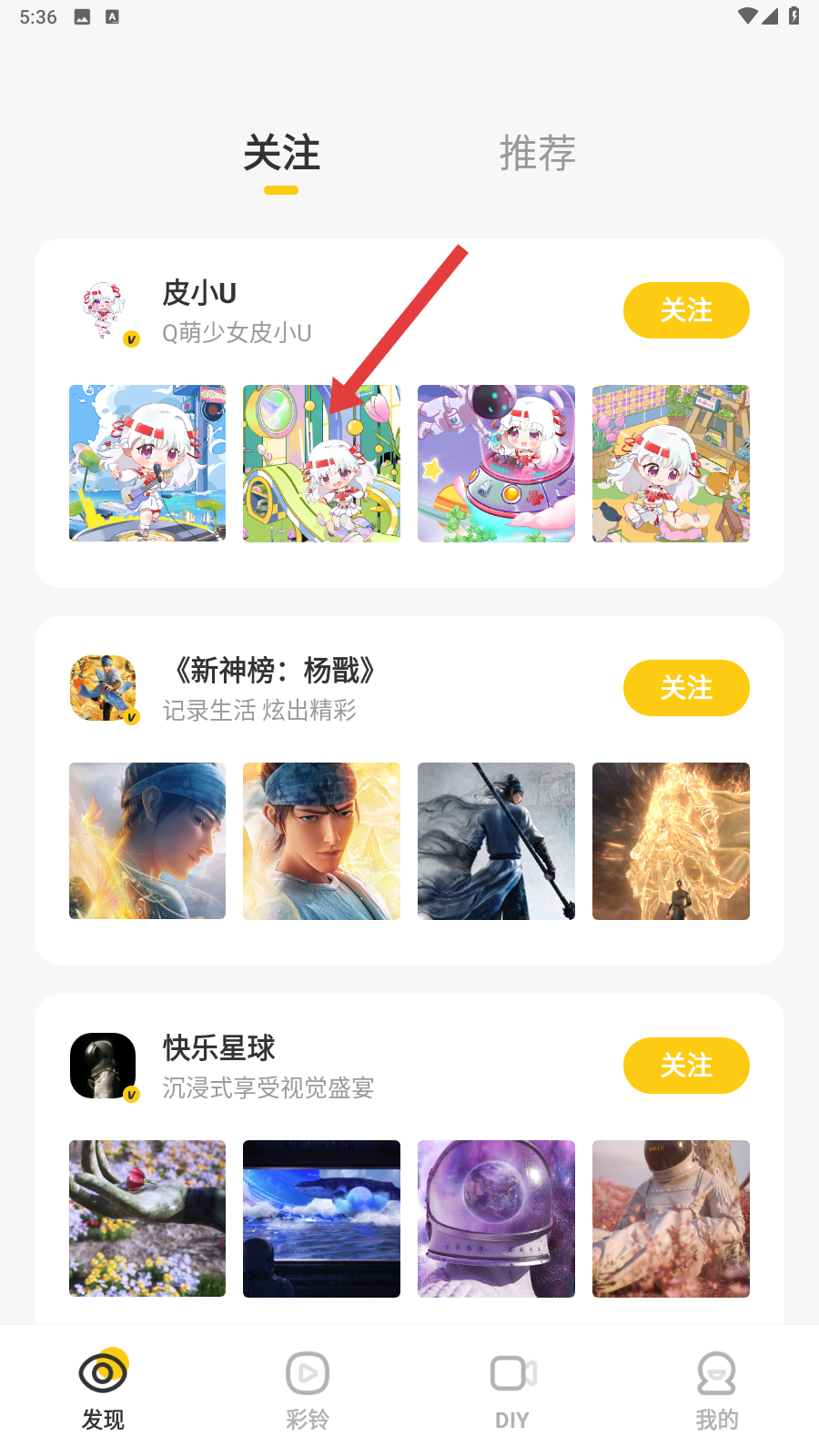 1、我们在关注页找到心仪的彩铃作品,比如【皮小U】的彩铃,点击进入详情页,开始分享操作啦。