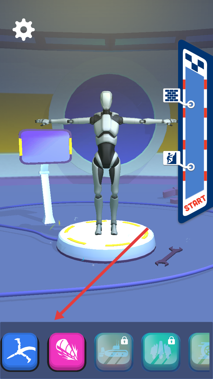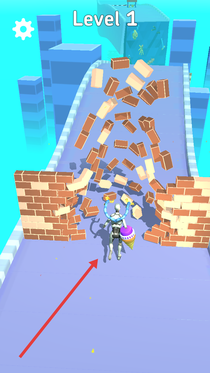 2、在攀岩和破墙关卡中,利用机器人的能力攀爬墙壁、击碎砖块,向终点推进。