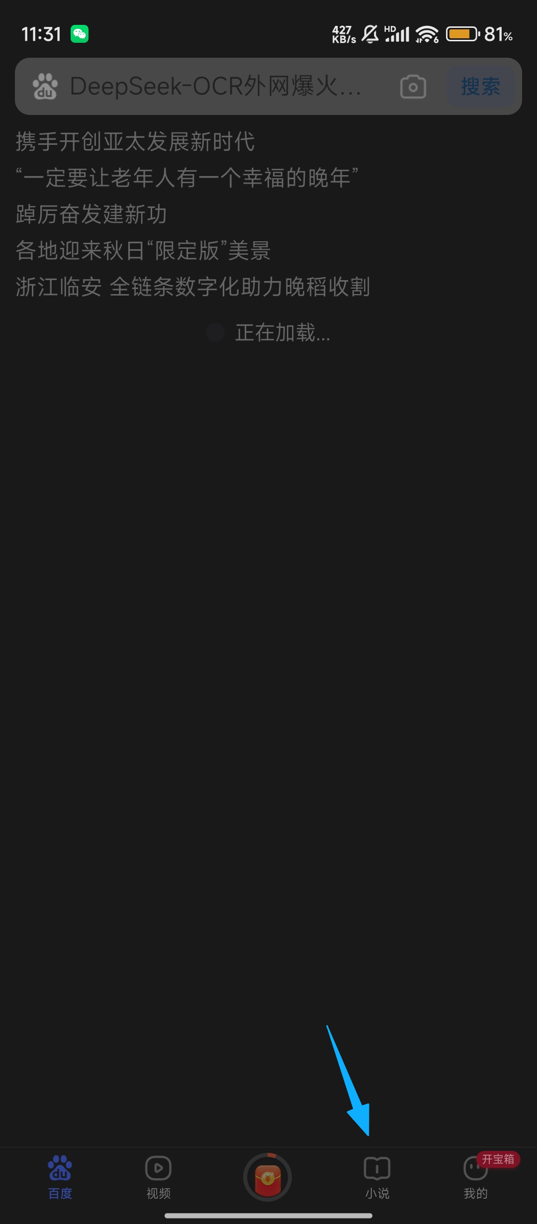 1、我们打开百度浏览器,点击底部【小说】按钮,进入小说板块,开启男生小说的阅读之旅哦。