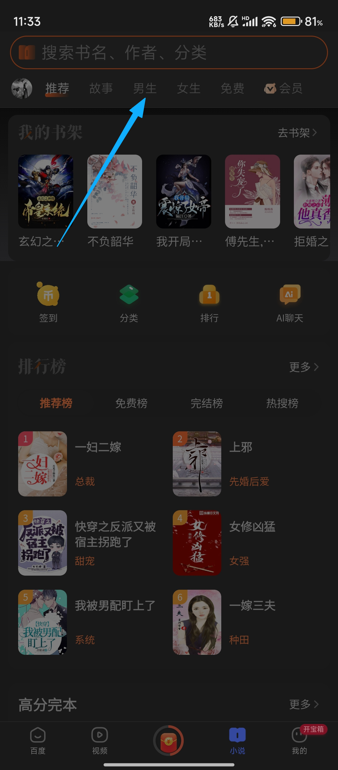 2、进入小说板块后,点击顶部【男生】标签,切换到男生小说分类,挑选喜欢的小说类型呢。
