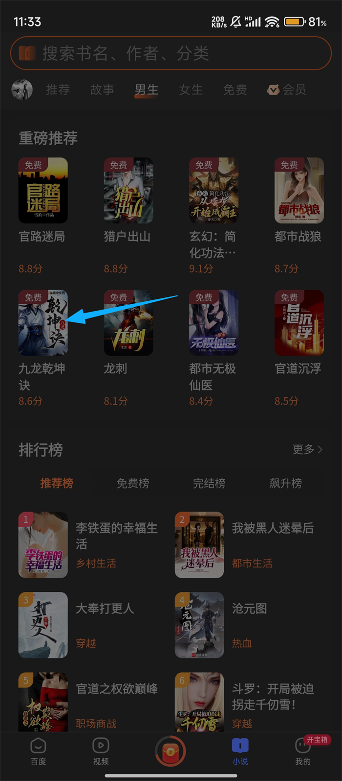 3、在男生小说分类中,找到感兴趣的小说,比如【九龙乾坤诀】,点击进入小说详情页啦。