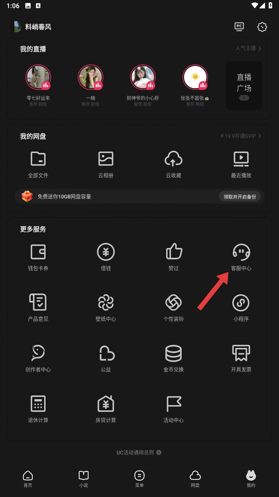2、在【我的】页面里,我们找到【客服中心】选项并点击,就能进入客服相关界面啦。