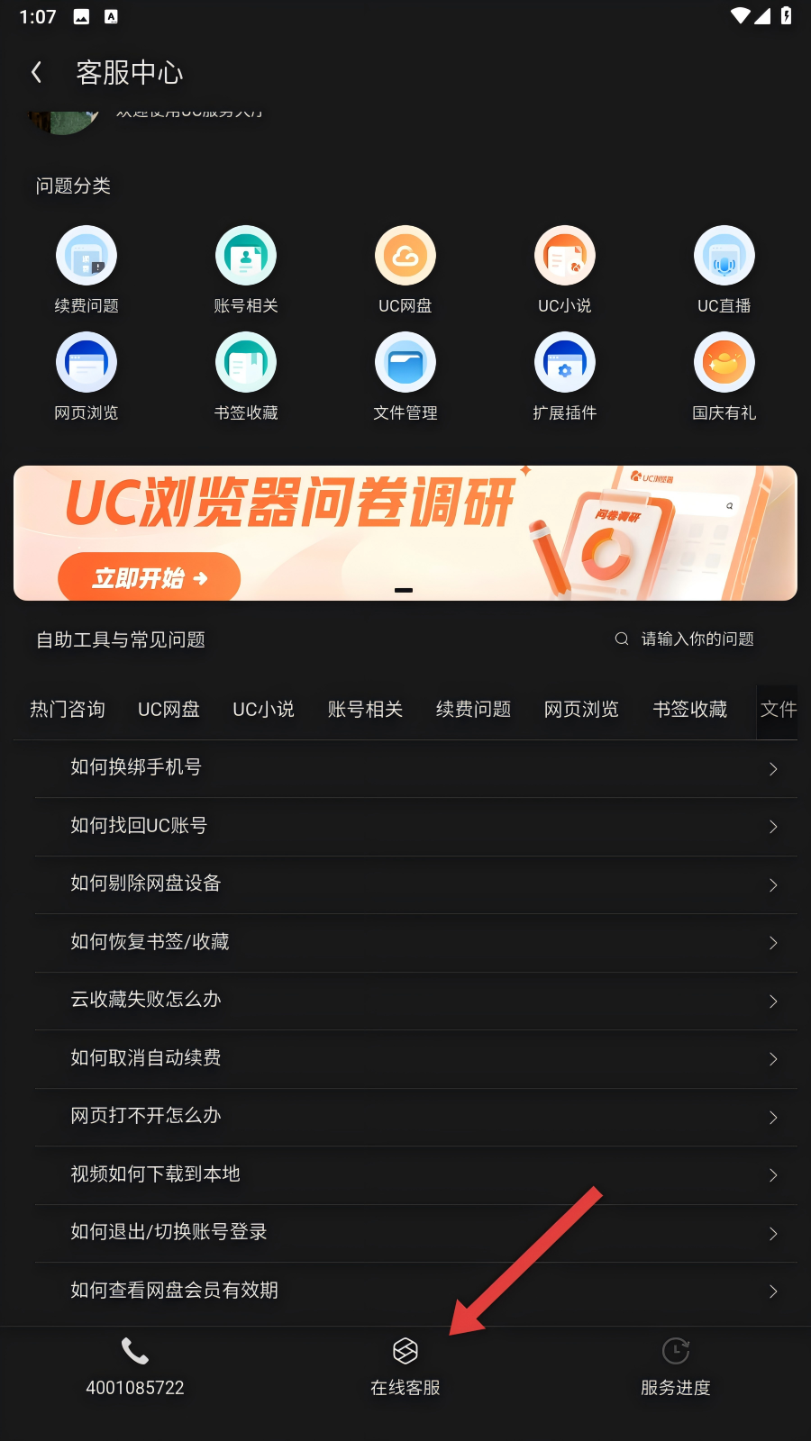 3、进入【客服中心】后,我们点击底部的【在线客服】选项,准备选择问题分类哦。