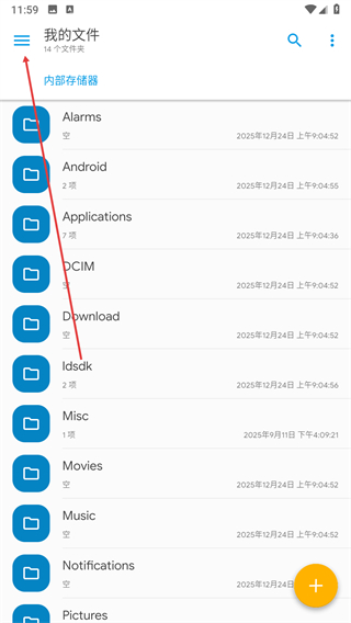 1、打开Solid Explorer的我的文件界面,点击左上角三条杠图标展开侧边栏菜单。