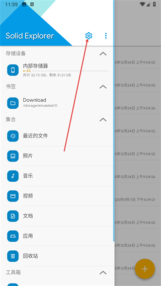 2、在侧边栏菜单中找到设置选项,点击该选项进入Solid Explorer的设置页面。