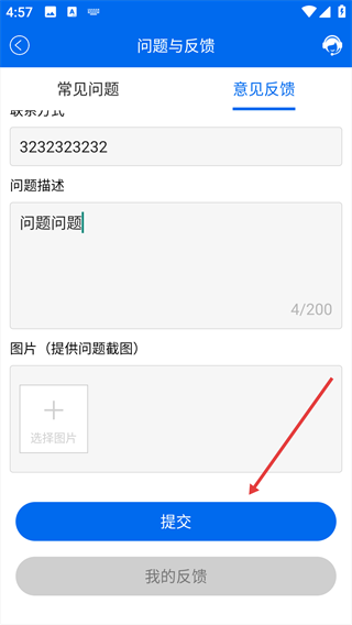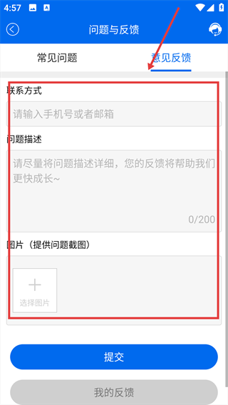 3、在意见反馈页面,填写联系方式、详细的问题描述,还可以上传截图。