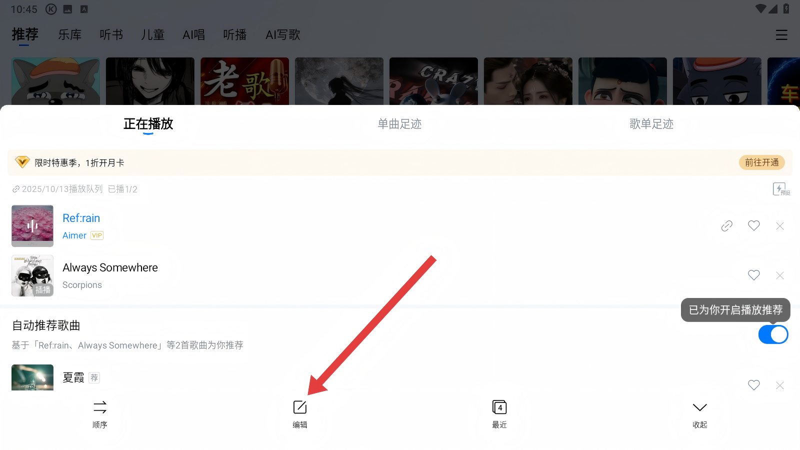 2、进入播放队列后,找到下方的【编辑】按钮点击,这样就能对队列里的歌曲进行操作咯。