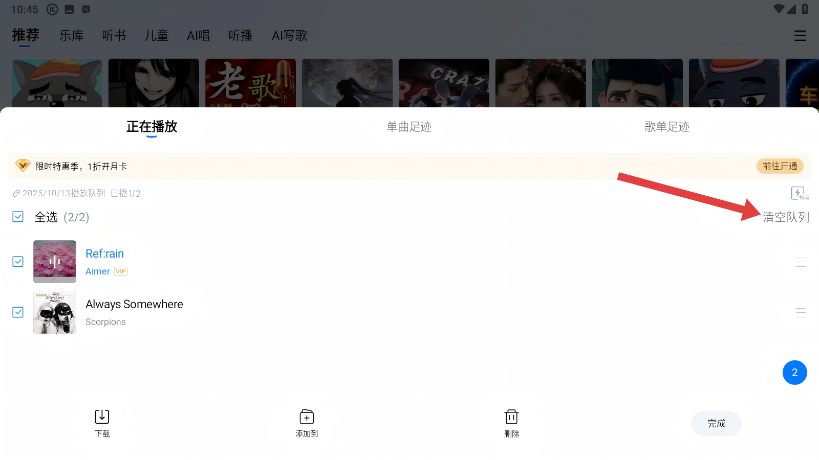 3、点击【编辑】后,再点击右侧的【清空队列】选项,准备删除所有播放歌曲吧。