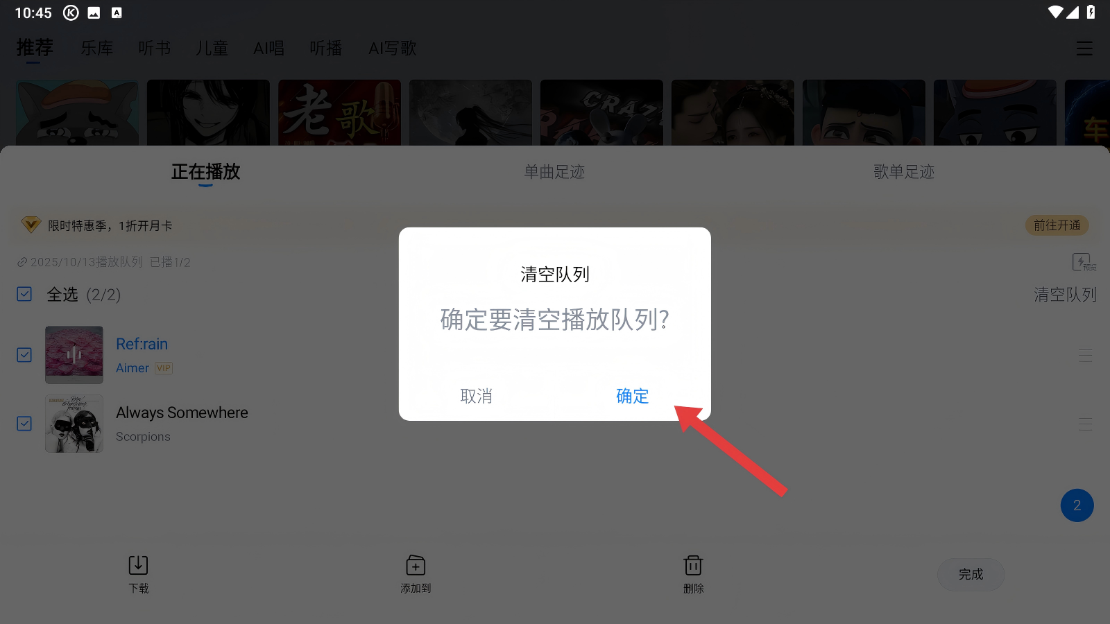 4、此时会弹出【清空队列-确定要清空播放队列】的提示框,咱点击【确定】,就成功清空播放列表啦。