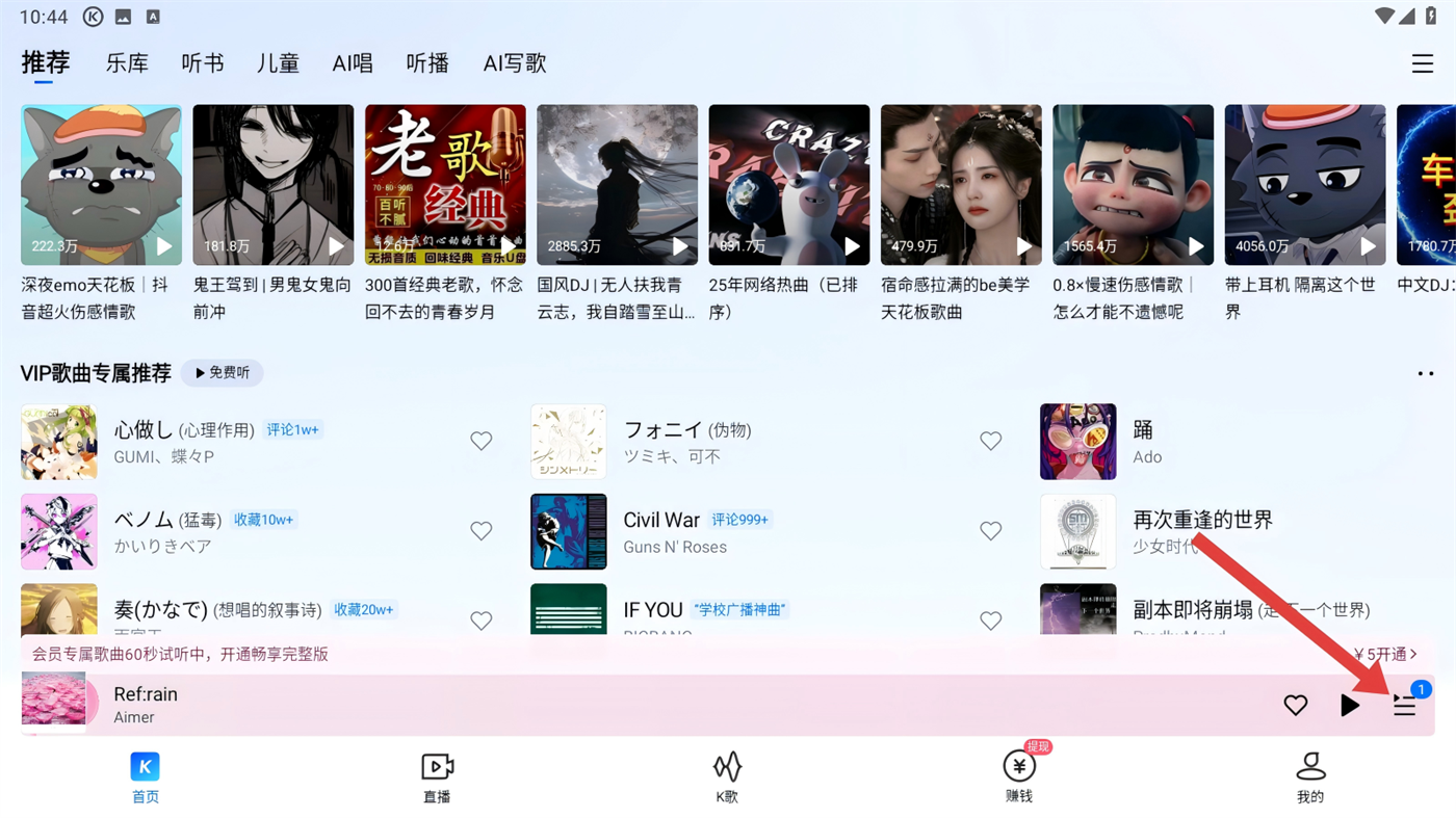 1、打开酷狗音乐后,咱点击播放栏右侧的【播放列表】图标,就能进入播放队列页面啦。