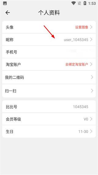 3、在个人资料页面,点击【昵称】。