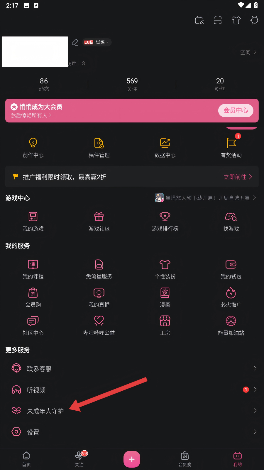 1、打开【哔哩哔哩】的我的页面,找到【未成年人守护】选项,点击它便能进入守护页面啦。