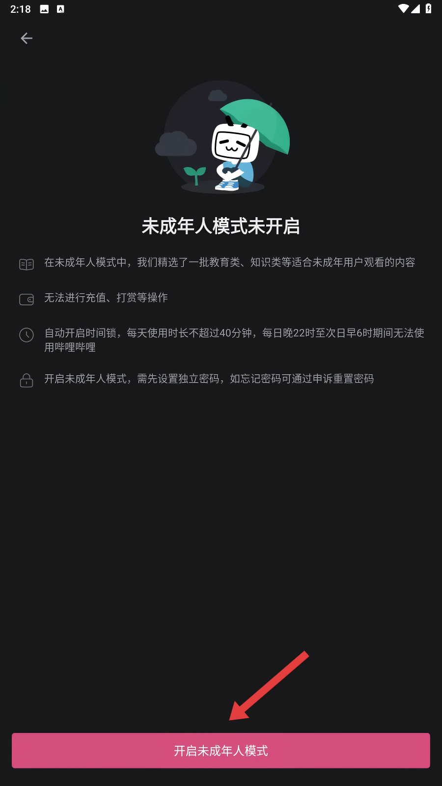 3、进入后能看到未成年人模式的相关说明,接着点击【开启未成年人模式】按钮,开启后续操作。