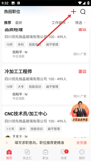 1、在app首页页面,点击右上角的加号按钮,进入求职意向管理界面。