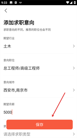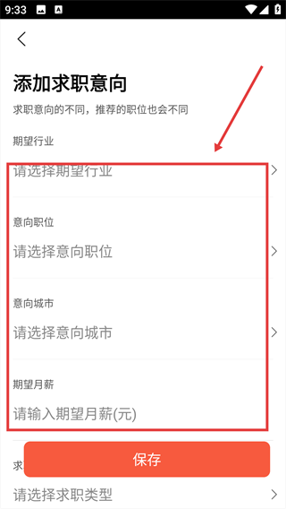 4、完成各项信息填写后,点击页面底部的“保存”按钮,确认并提交个人求职意向。