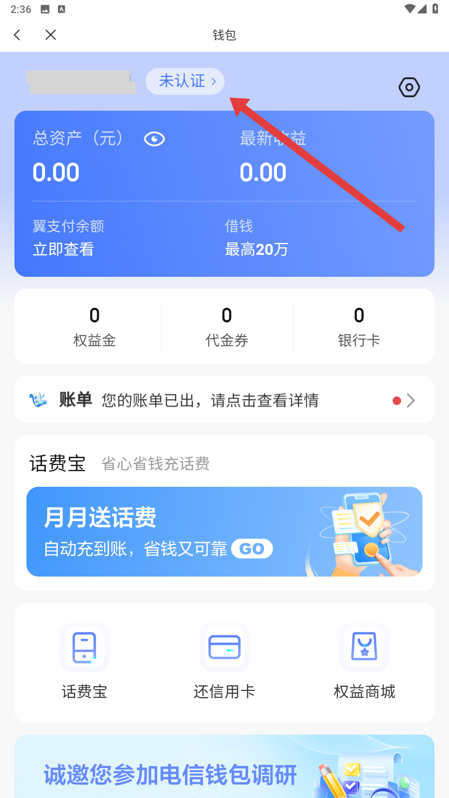 1、我们打开中国电信APP,点击【我】页面的【我的钱包-进入】,进入钱包界面开启实名认证流程啦。