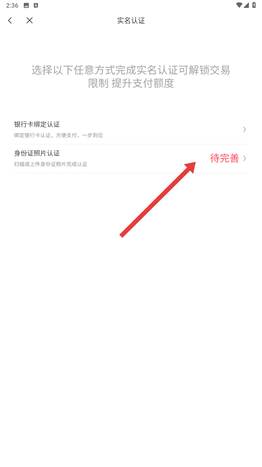 3、在实名认证页面,选择【身份证照片认证-待完善】,进入证件上传环节呢。