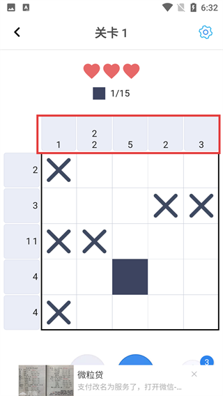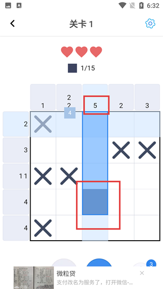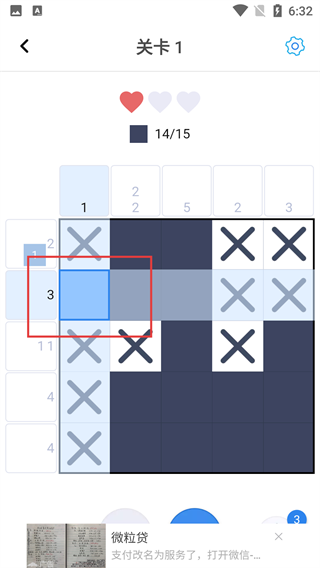 3、注意剩余血量,填充方块至【14/15】时,避开【X】格,优先补全空缺区域。