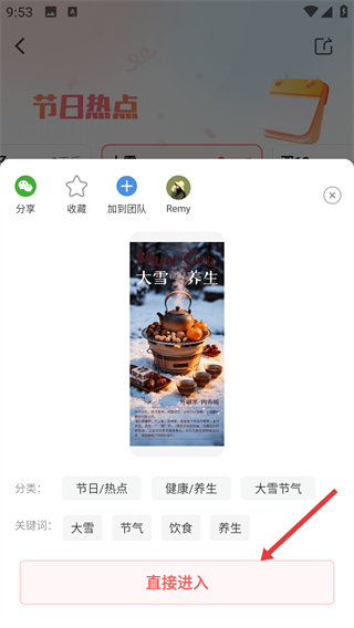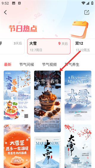 2、我们可以在【节日热点】中选【大雪】分类,浏览对应的节气素材呀。