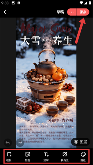 4、进入【Major-Snow】素材的编辑页,用【加图】、【加字】等工具编辑,完成后点【保存】生成海报啦。