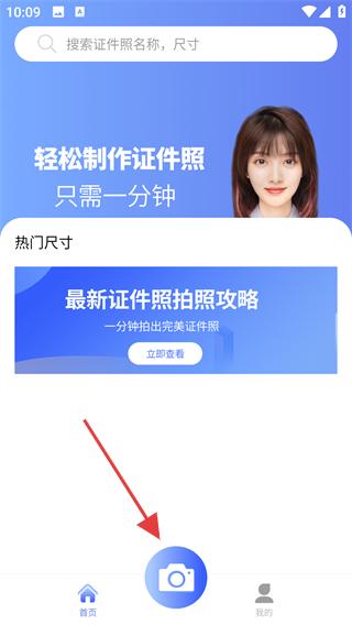 1、进入清颜证件照主页,点击底部相机按钮,进入拍照攻略界面。