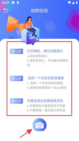 2、查看拍照攻略:打开相机用后置、选好背景、穿与背景色差大的服装并露出五官。