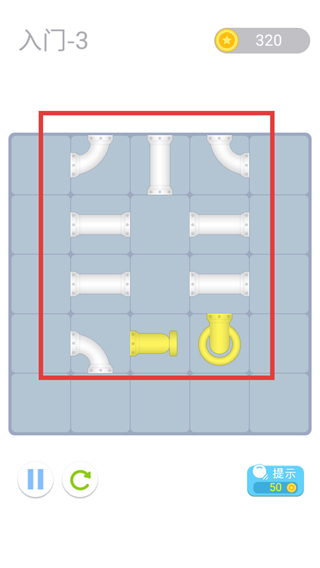 2、处于【入门-3】关卡,移动红框内的管道部件,将其拼接成连通的管路。