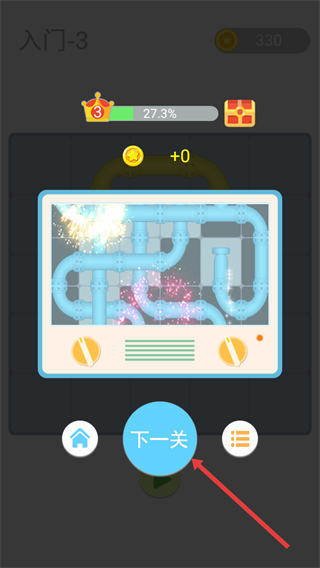 4、关卡完成后获得【330-金币】,点击【下一关】进入新的管道拼接关卡,继续挑战。