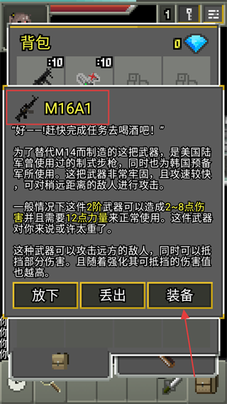 2、背包中找到【M16A1】武器,查看其2阶属性后点击装备,提升远程攻击能力应对怪物。