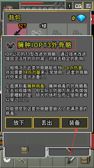 4、背包中找到【臃肿IOPT3外骨骼】,查看防御属性后点击装备,增强生存能力继续冒险。