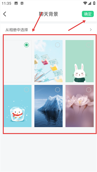 4、从预设背景图选定目标背景,再点击右上角的【确定】按钮,完成聊天背景的设置操作。