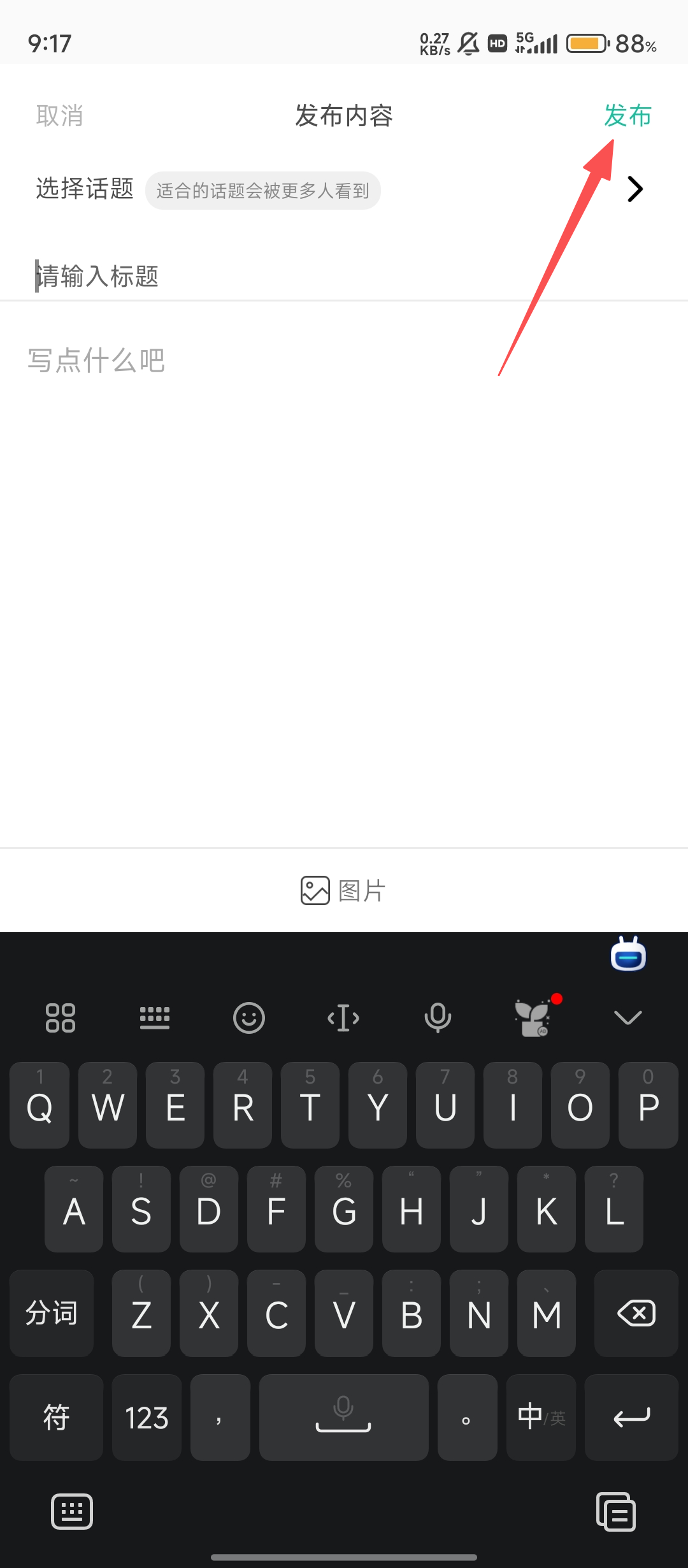 4、进入【发布内容】页面后,选好话题、输入标题和内容,还能添加图片,最后点击【发布】,帖子就分享出去啦。