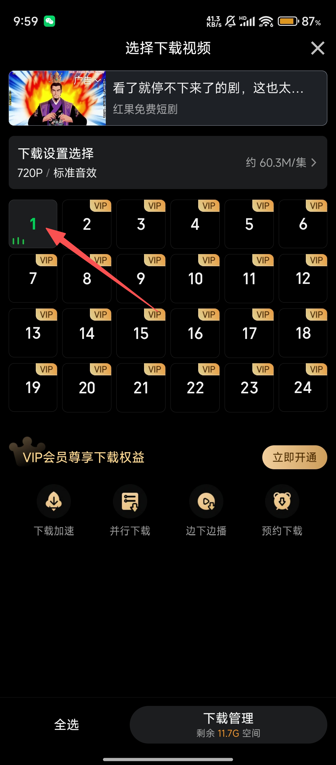 4、在【选择下载视频】页面,挑选想下载的集数,像标着【1】的集数,选好后便可以开始下载啦。