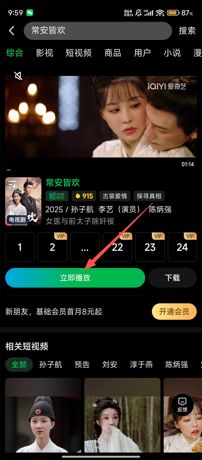 2、搜索结果里找到【常安皆欢】,瞧见绿色的【立即播放】按钮,点击它就可进入播放页面咯。