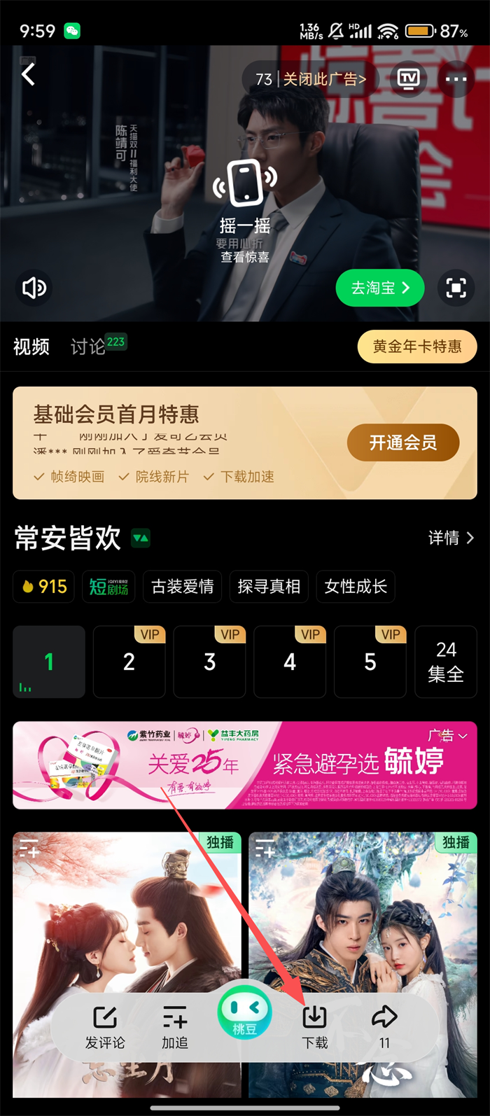 3、进入播放页后,找到下方的【下载】按钮,轻轻一点,就能够准备选择要下载的剧集啦。