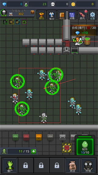 1、在主界面持续制作并合成僵尸,积累高阶僵尸以提升队伍战斗力,同时完成合成进度目标可获取钻石等资源奖励。