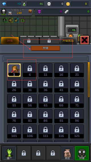 2、切换至“狩猎”界面,选择解锁的狩猎关卡(如狩猎1),进入战斗场景,该玩法是获取资源与提升等级的核心途径。