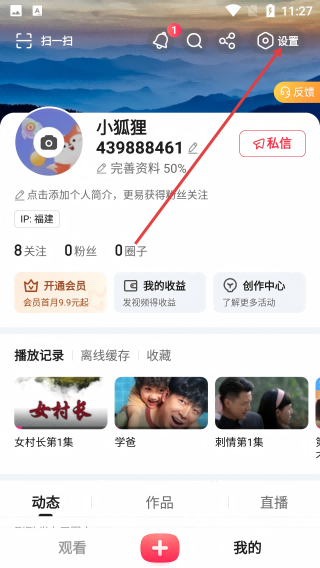 1、进入搜狐视频“我的”页面,点击右上角【设置】选项。