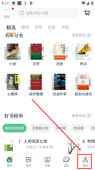 1、打开藏书馆APP后,点击底部导航栏的【借书】图标进入借书界面。