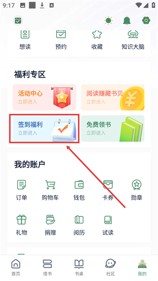 2、进入【我的】页面后,找到【福利专区】下的【签到福利】选项并点击,可参与签到活动。