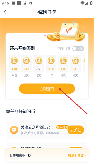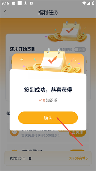 4、点击【立即签到】后,会弹出【签到成功-恭喜获得+10-知识币】的提示,点击【确认】即可完成签到。