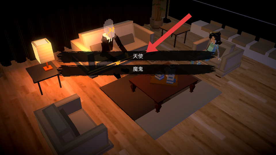 1、进入游戏场景,看到角色旁出现选项,点击【天使】选项推进剧情。