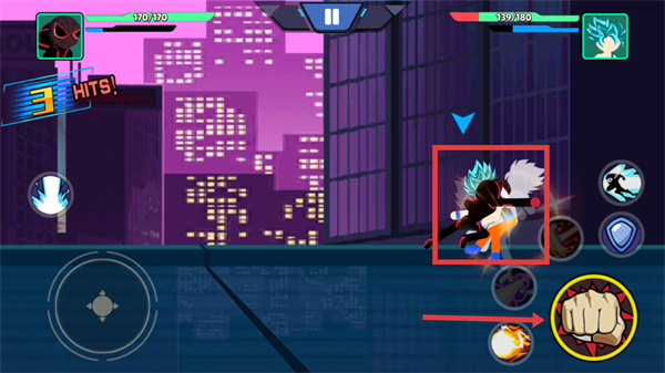 3、点击右侧拳头按钮发起攻击,命中红框内的敌人,累计造成伤害推进战斗进度。