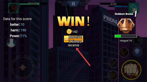 4、战斗胜利后,点击【Receive】领取【142-金币】等奖励,完成本局对战的结算。