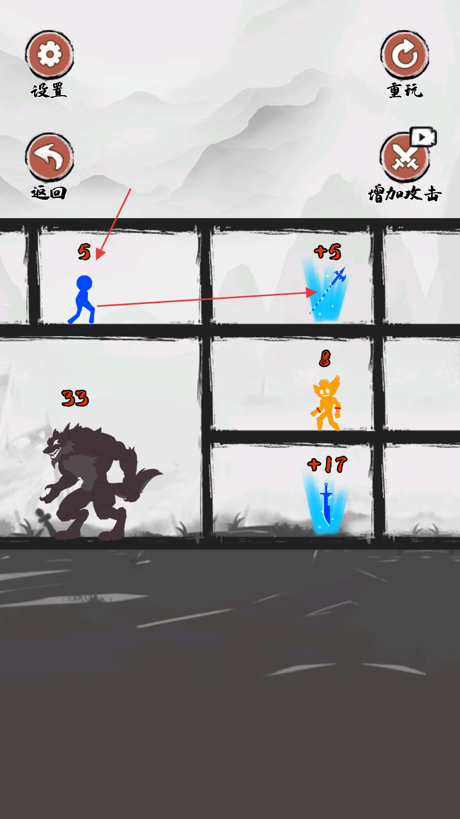 3、操控蓝色小人移动到红色箭头指向的武器处,获取武器提升攻击力。