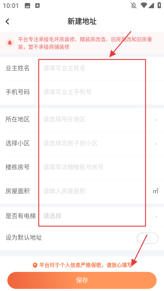 4、填写业主姓名、手机号码、所在地区等信息后,点击【保存】,完成地址添加。