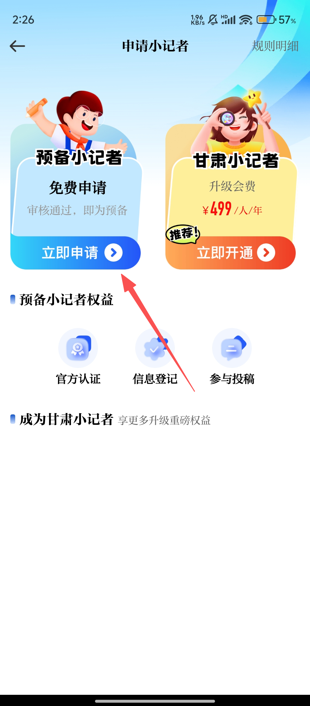 3、进入申请小记者页面,选择【预备小记者-立即申请】,免费申请,审核通过即可成为预备小记者,权益丰富呢。