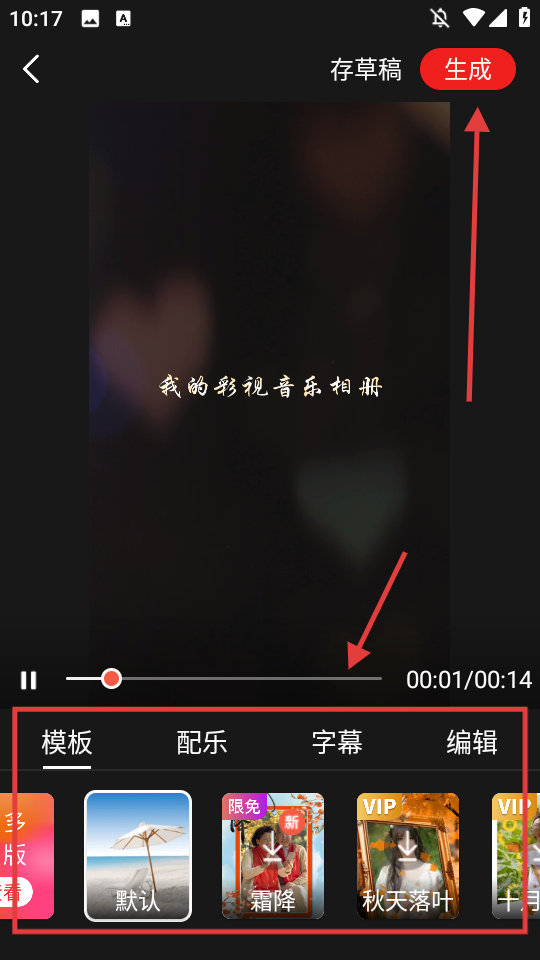 4、在影集编辑界面可选择模板、配乐、字幕等进行编辑,完成后点击【生成】。