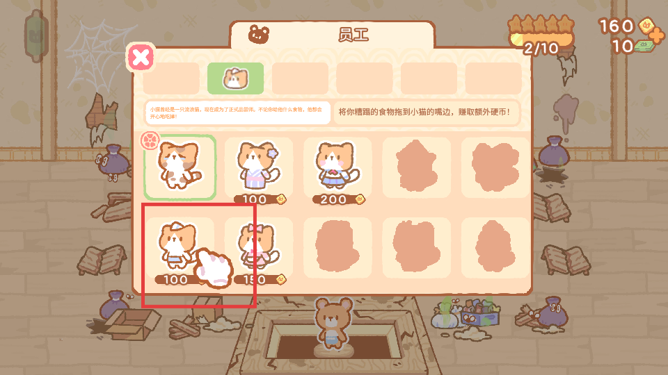 1、花费100金币雇佣猫咪员工,增加经营助力。