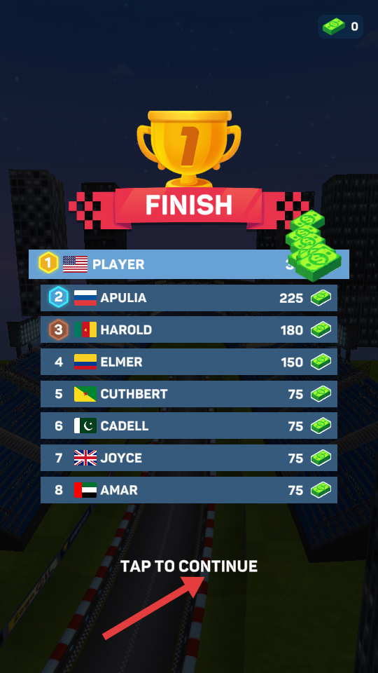 4、比赛完成后,点击【TAP-TO-CONTINUE】,领取奖励,继续下一场赛车挑战。